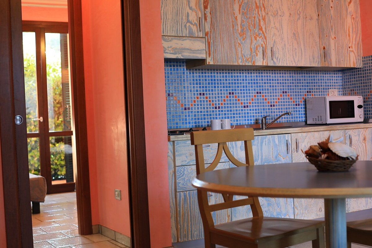 – Bilocale di 45mq al piano terra, ideale per 4 persone. È composto da soggiorno con angolo cottura attrezzato con mini frigo, 2 piastre elettriche e forno a microonde, TV color, divano letto doppio con materassi ortopedici, camera matrimoniale e poltrona letto, telefono e cassetta di sicurezza privata, servizio con box doccia e asciugacapelli;
